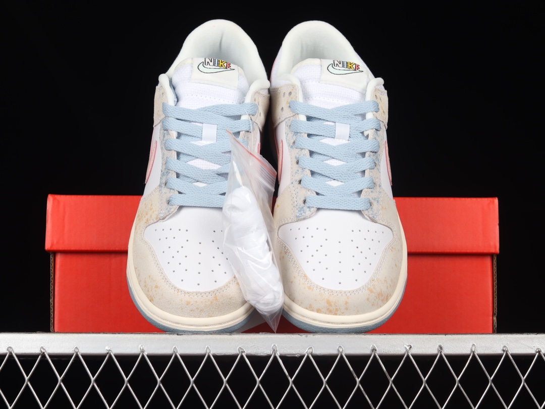 此款Nike Dunk Low采用白色皮革底座,搭配网眼鞋舌和鞋 领。粉红色皮革Swoos突出了褪色、磨损的绒面革覆盖层和 彩色品牌鞋舌标签。蓝色研磨橡胶外底上的Sail中底完善了 设计。